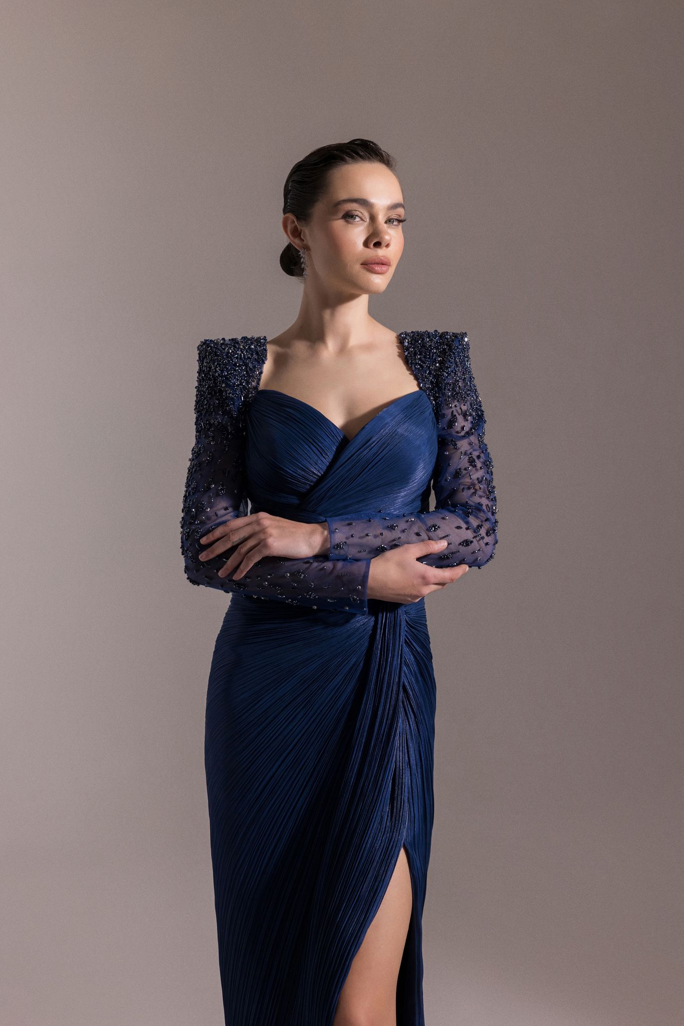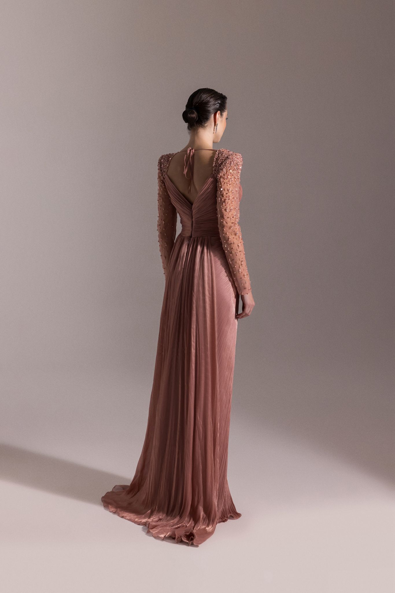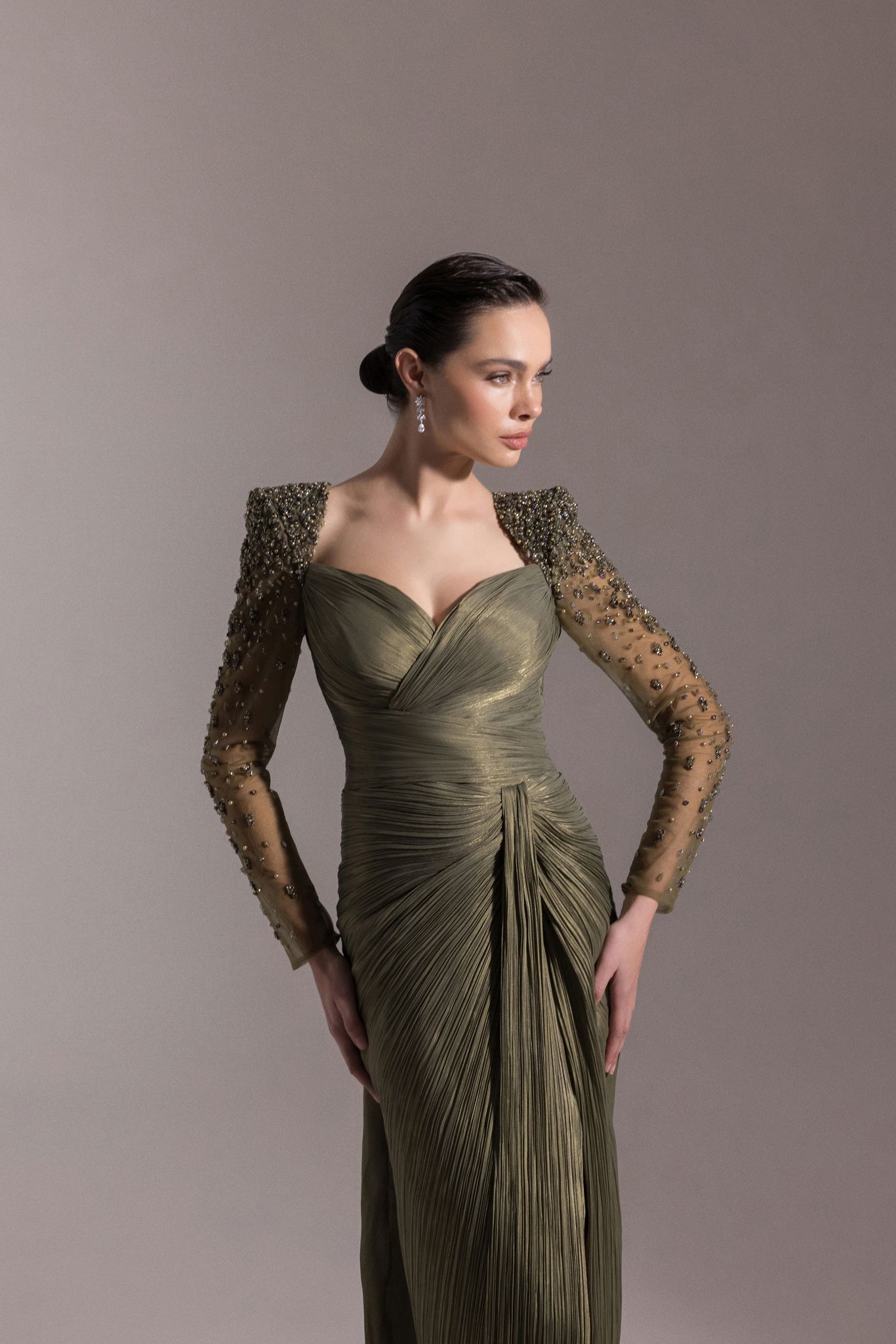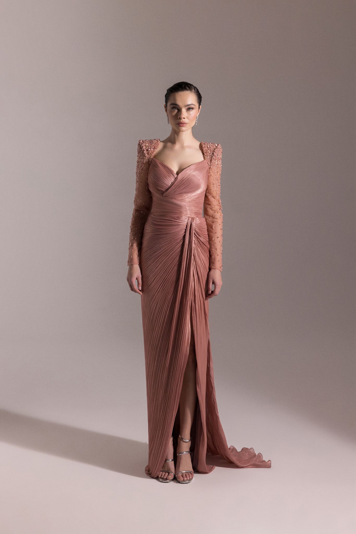 فستان سهرة مميز بقماش عصري حديث من الثنيات ليضفي انوثة وجمال لاطلاتك