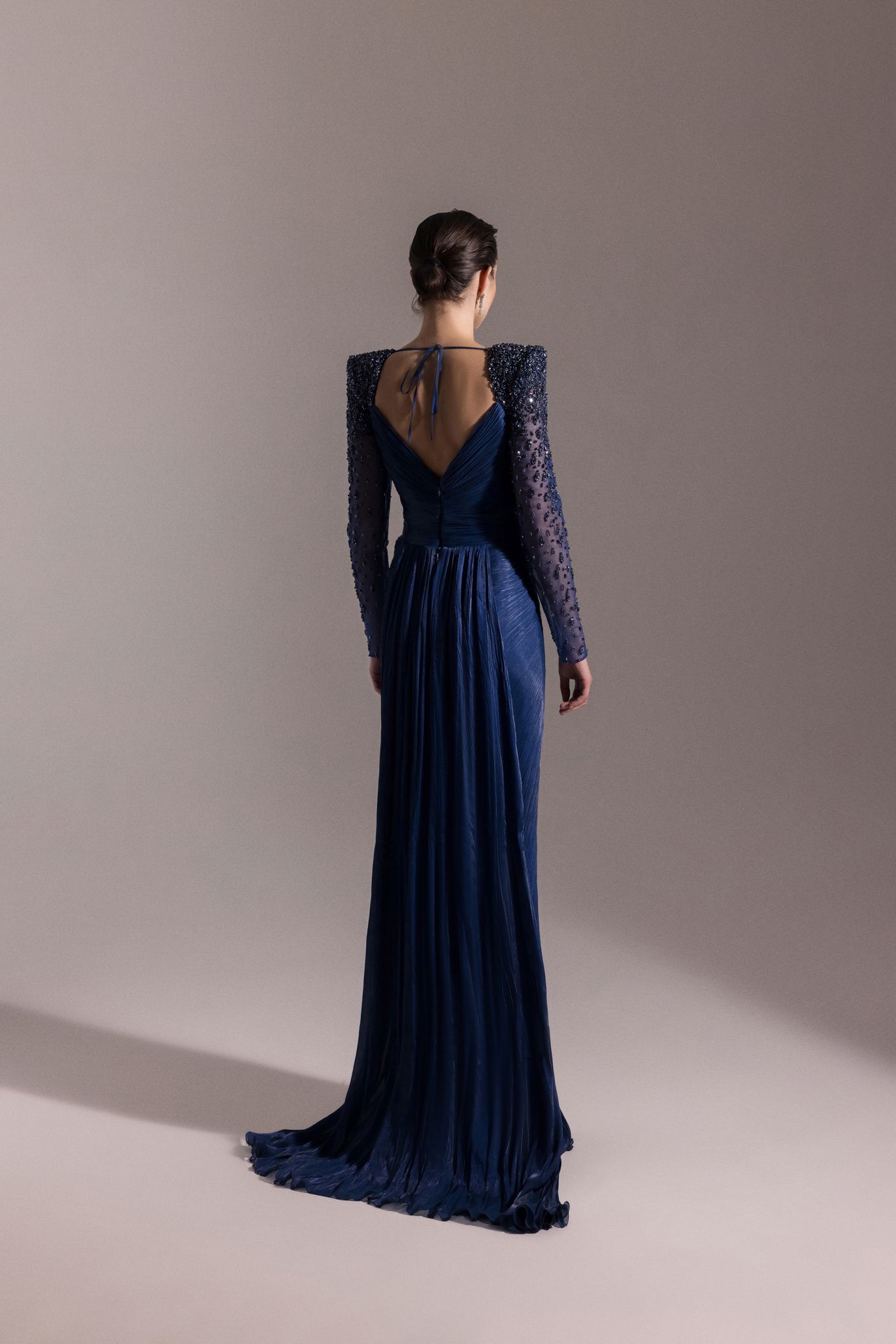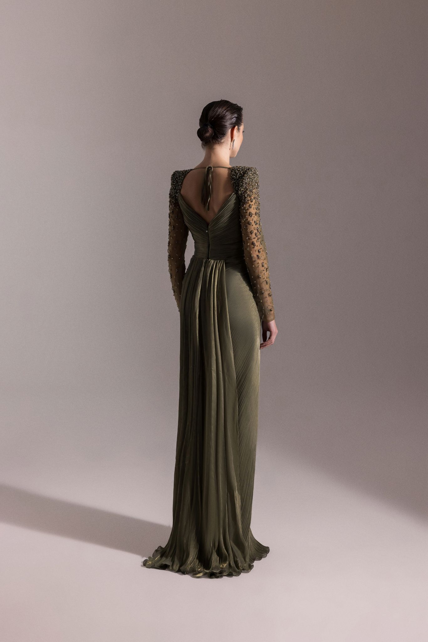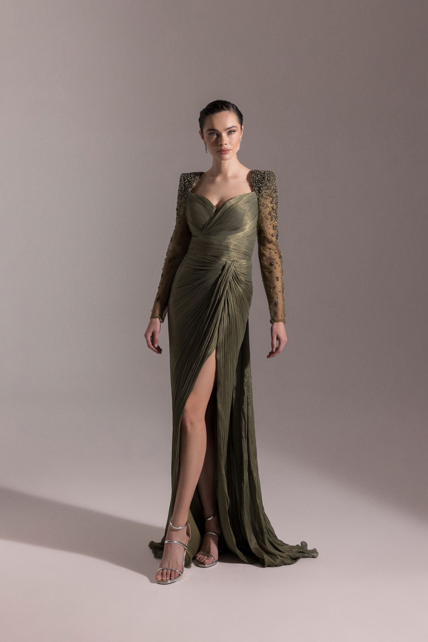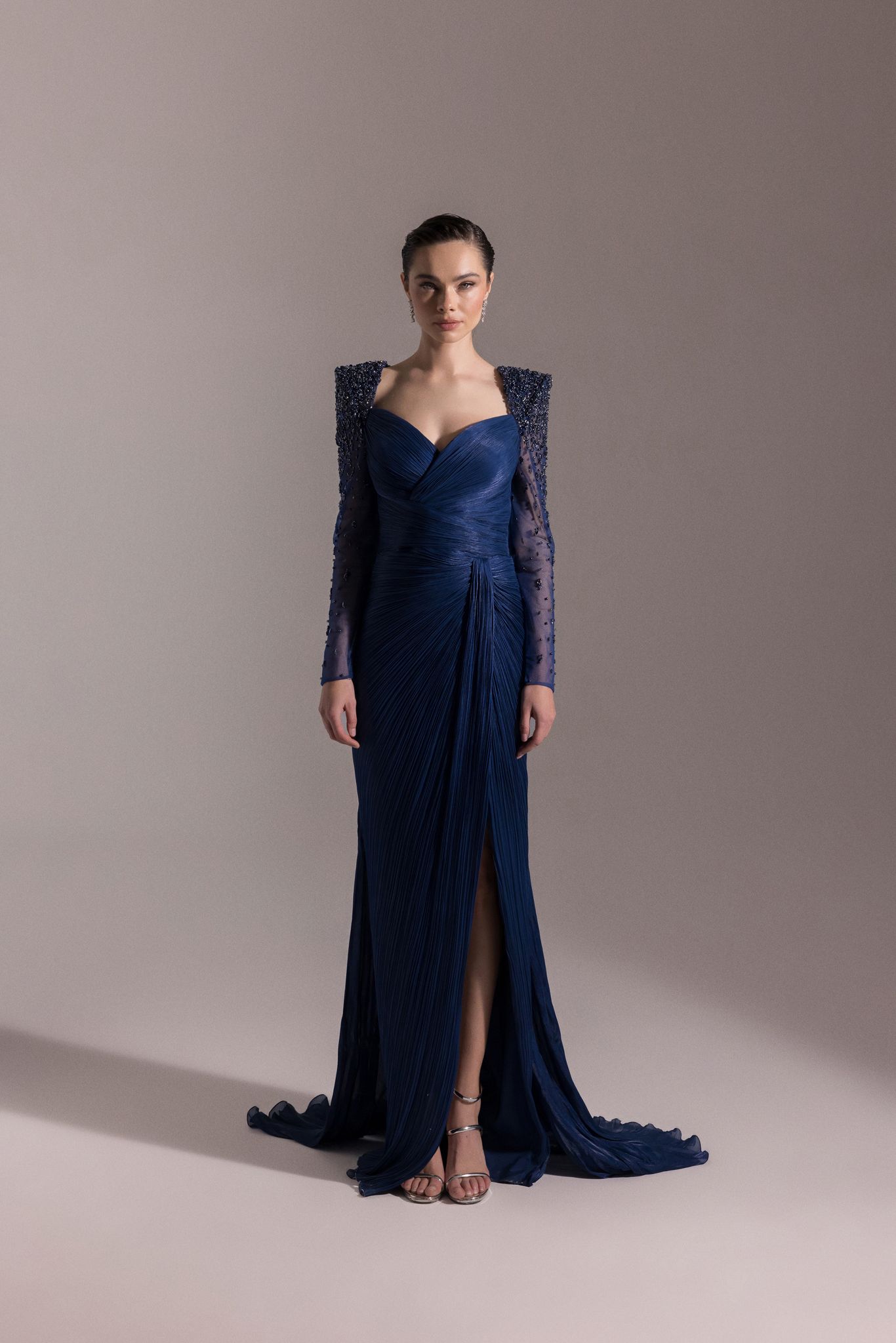 فستان سهرة مميز بقماش عصري حديث من الثنيات ليضفي انوثة وجمال لاطلاتك