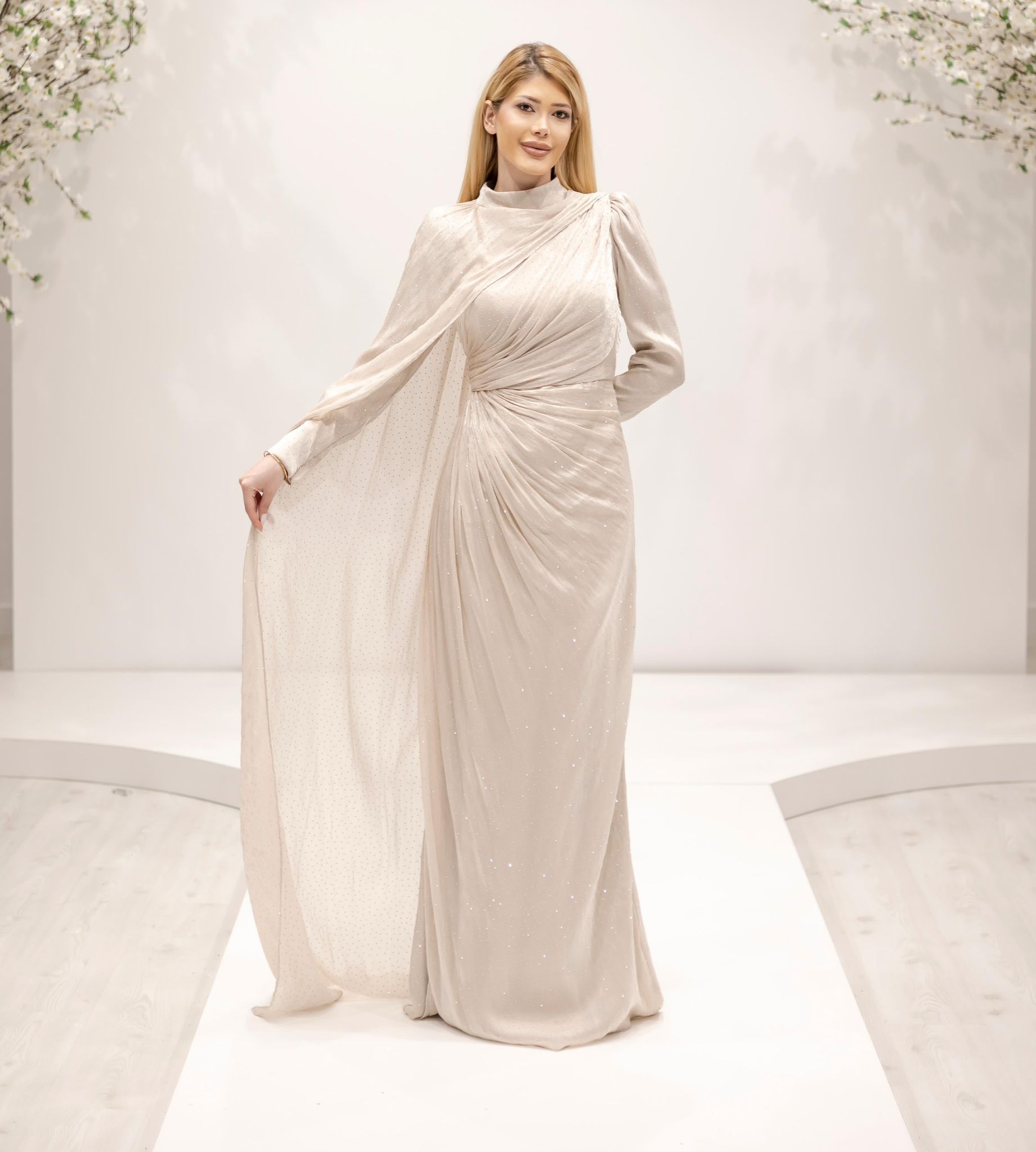 فستان سهرة مميز لسهرة رائعة يتميز بخرز ناعم وشال كتف لاضفاء لمسة انوثة