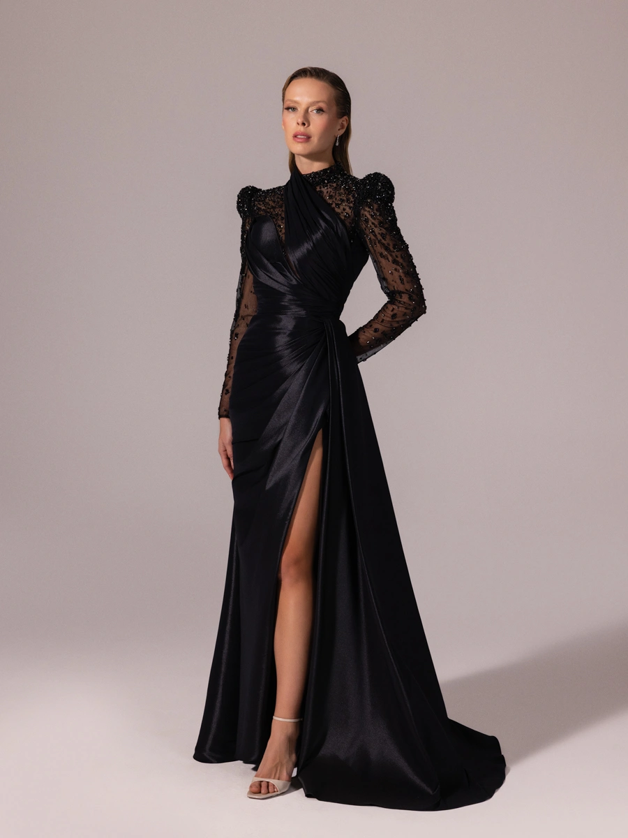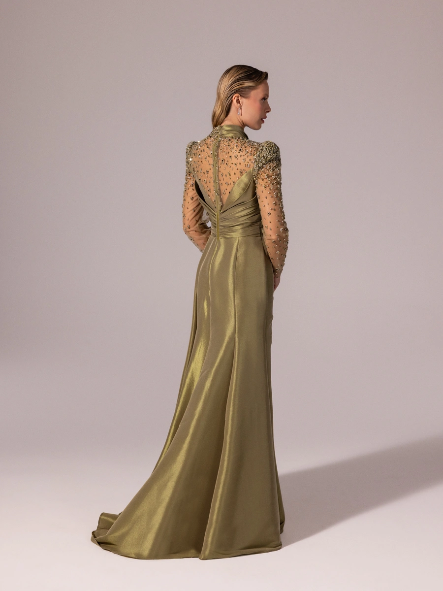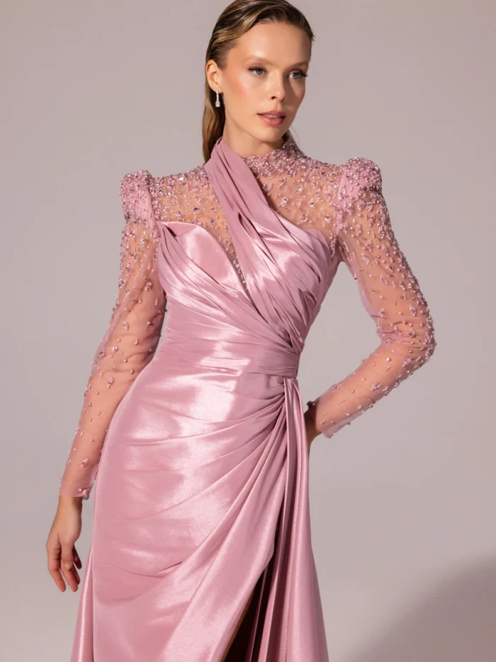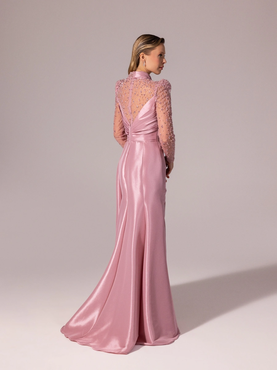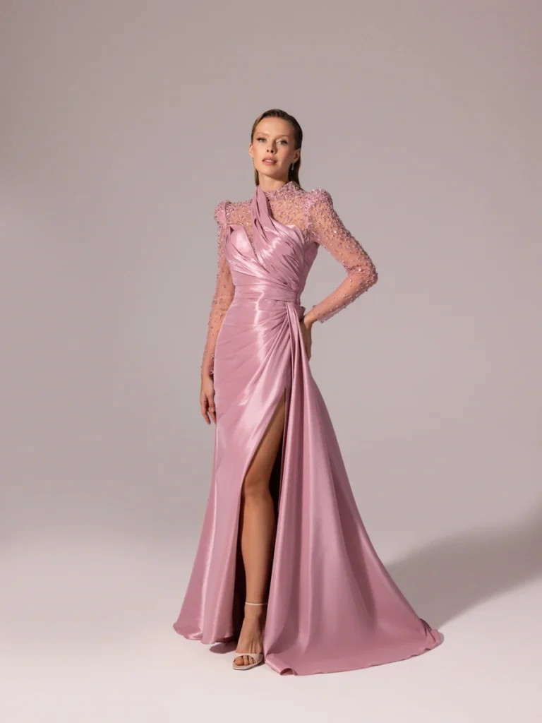 فستان سهرة مميز من قماش كريب ستان تصميم عصري يضفي جمالا وانوثة لاطلالتك