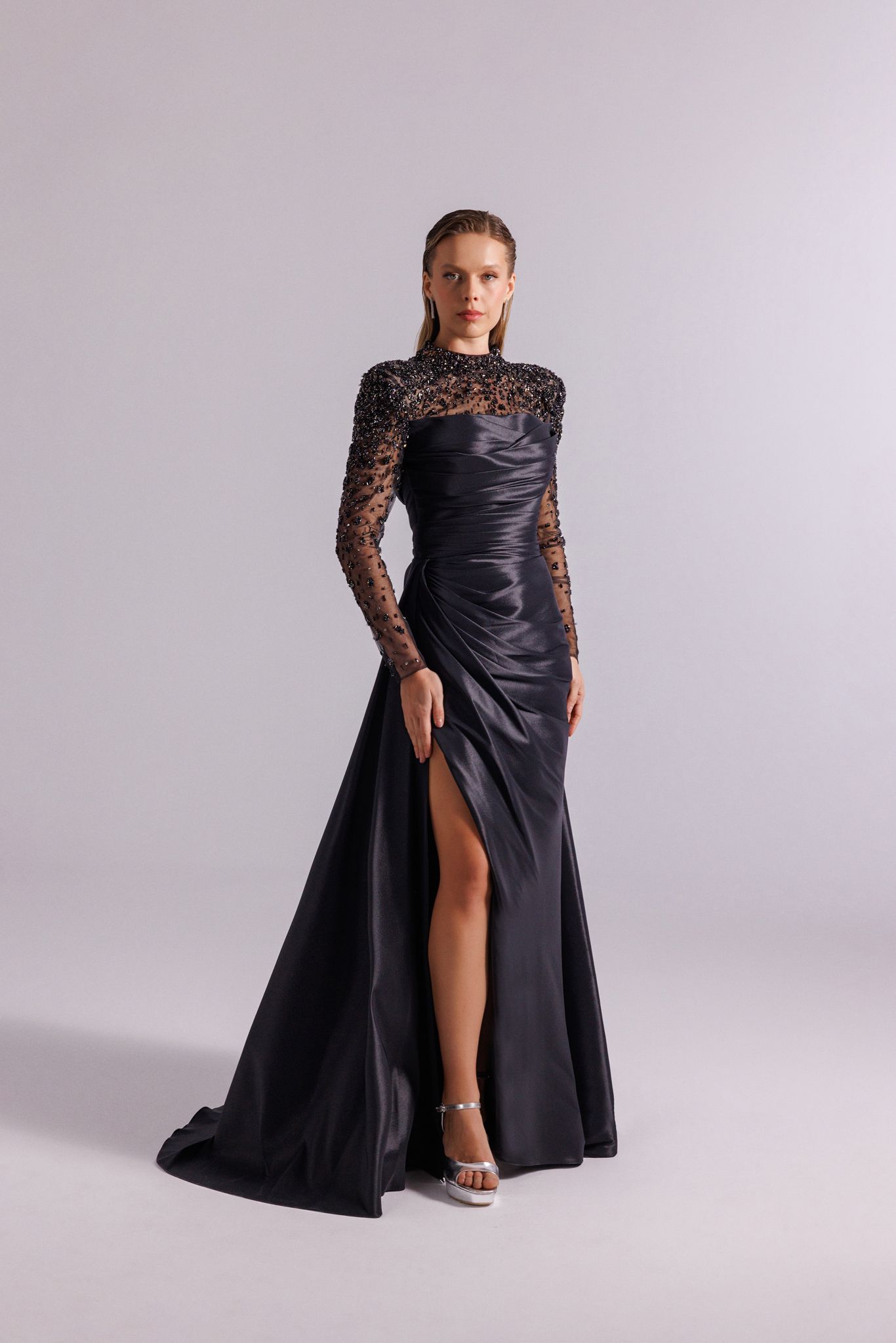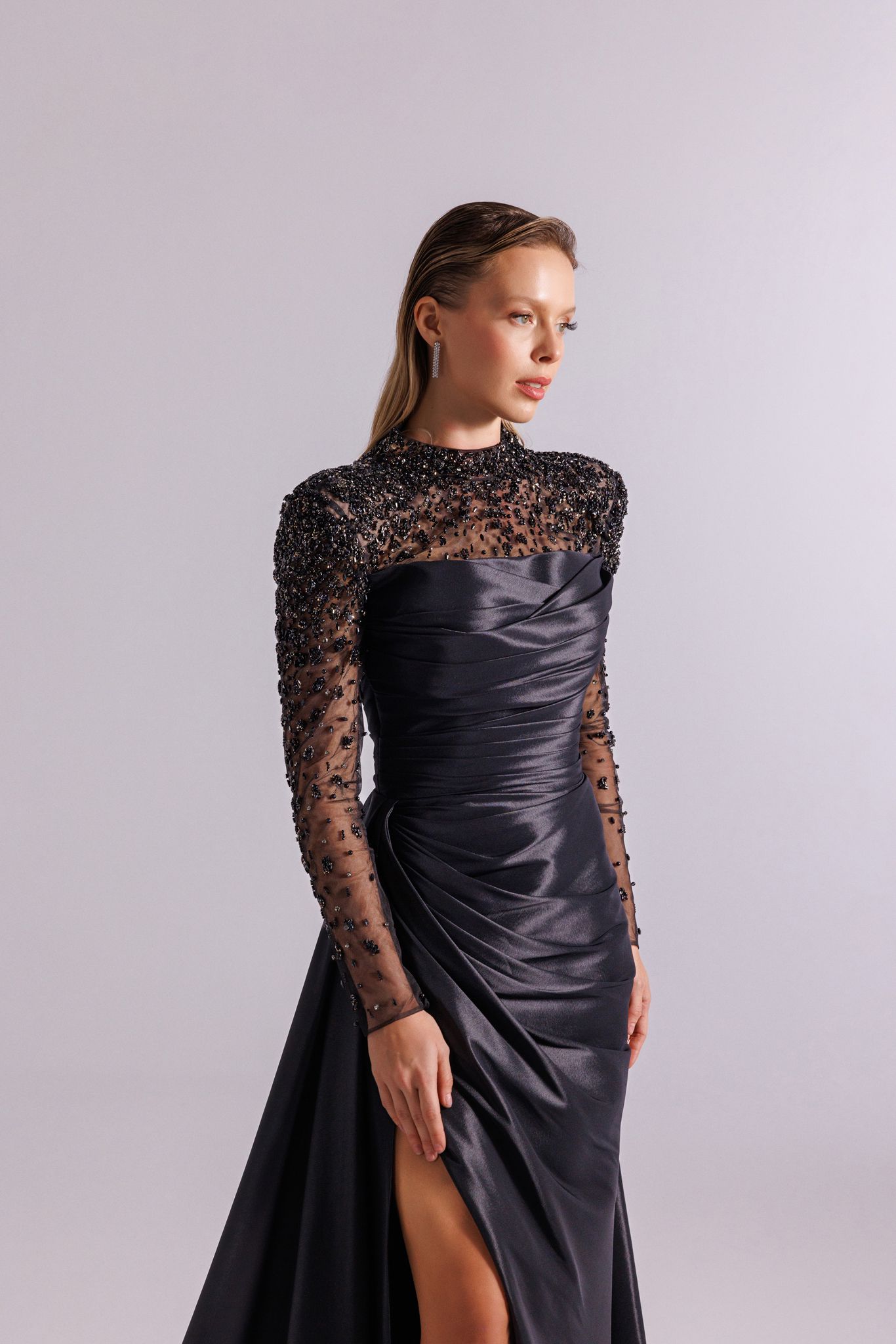 فستان سهرة بتصميم عصري حديث بقماش ستان كريب وتطريز من الخرز