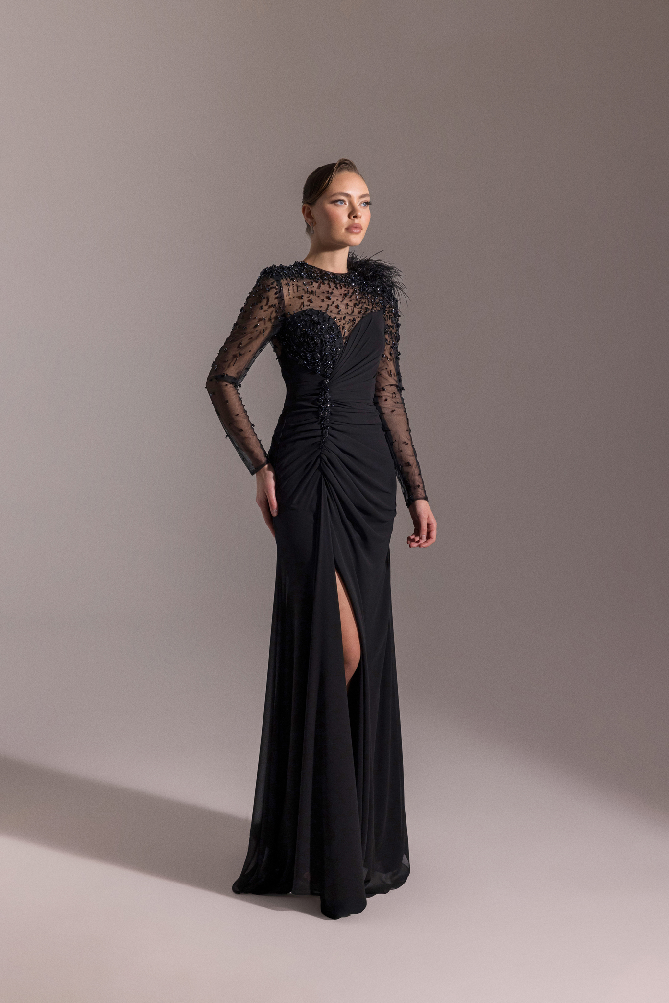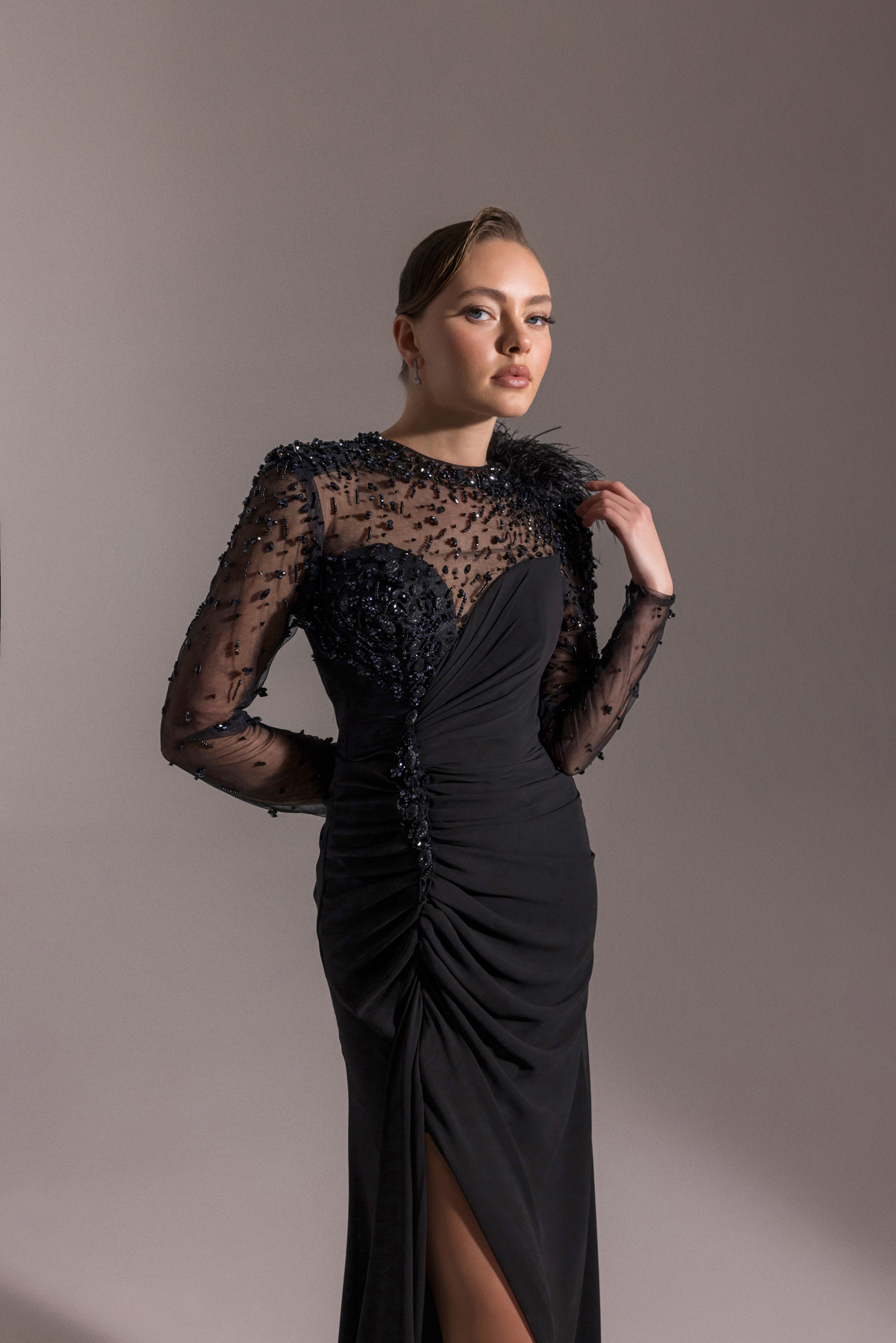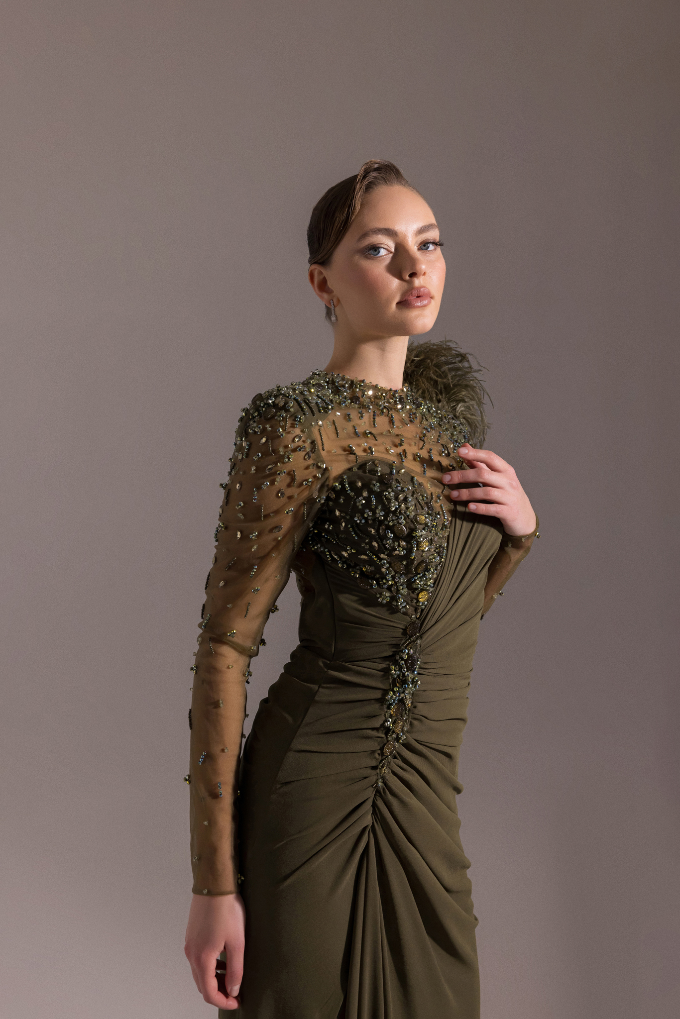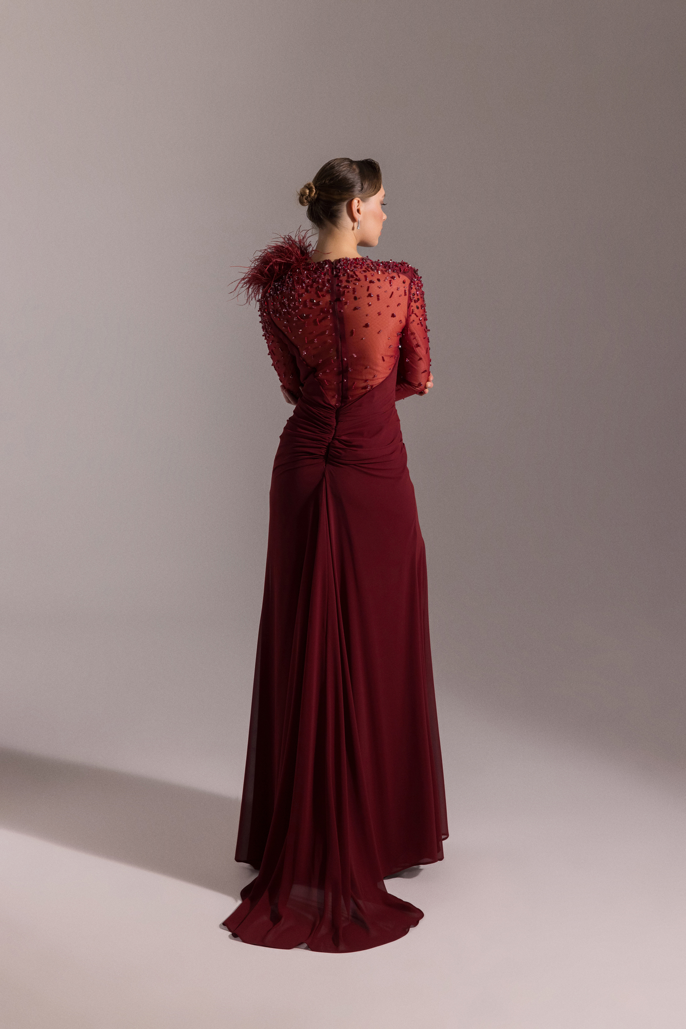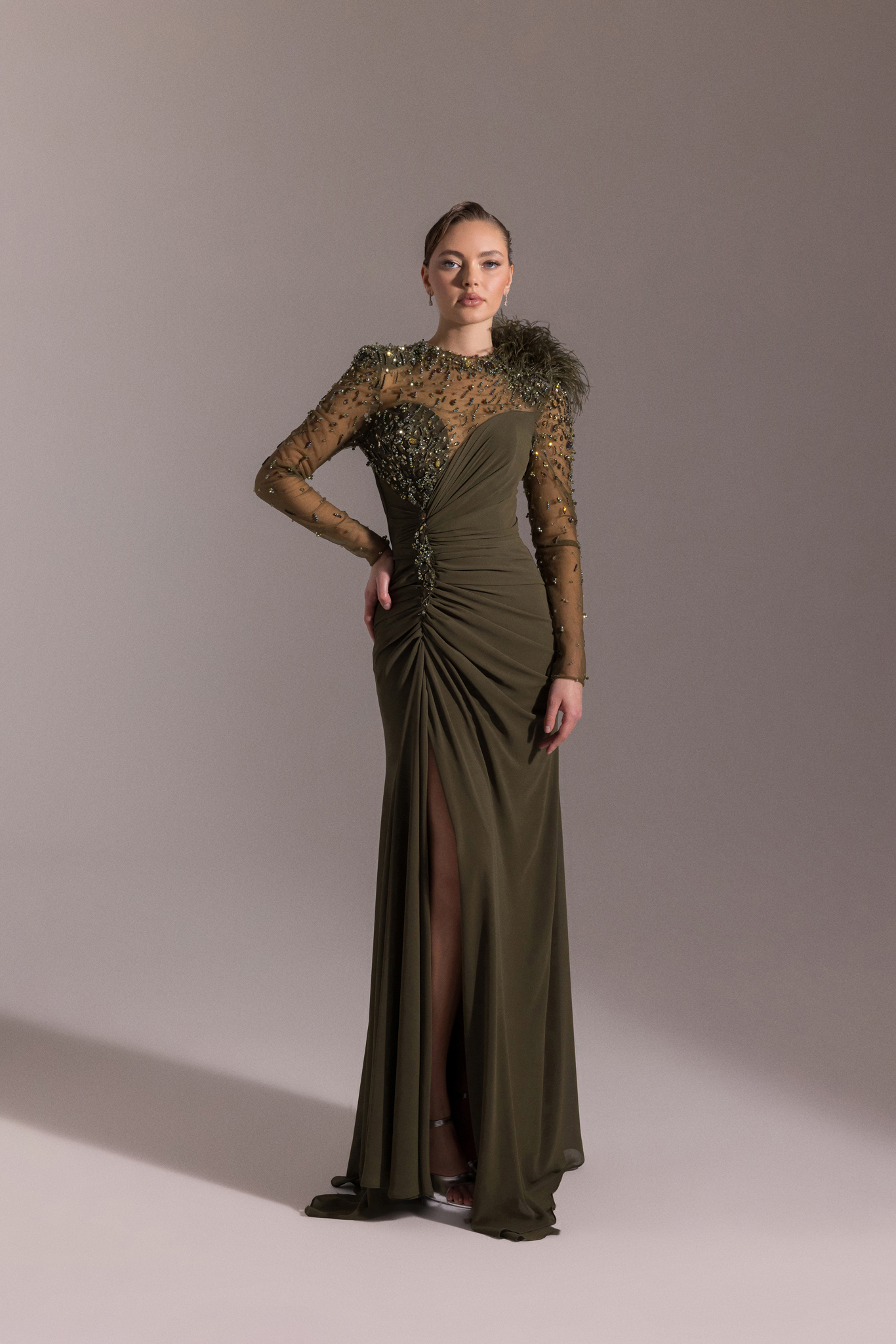 فستان سهرة من قماش الجورجيت يتميز باريش على الكتف ومطرز بالخرز ع الاكمام