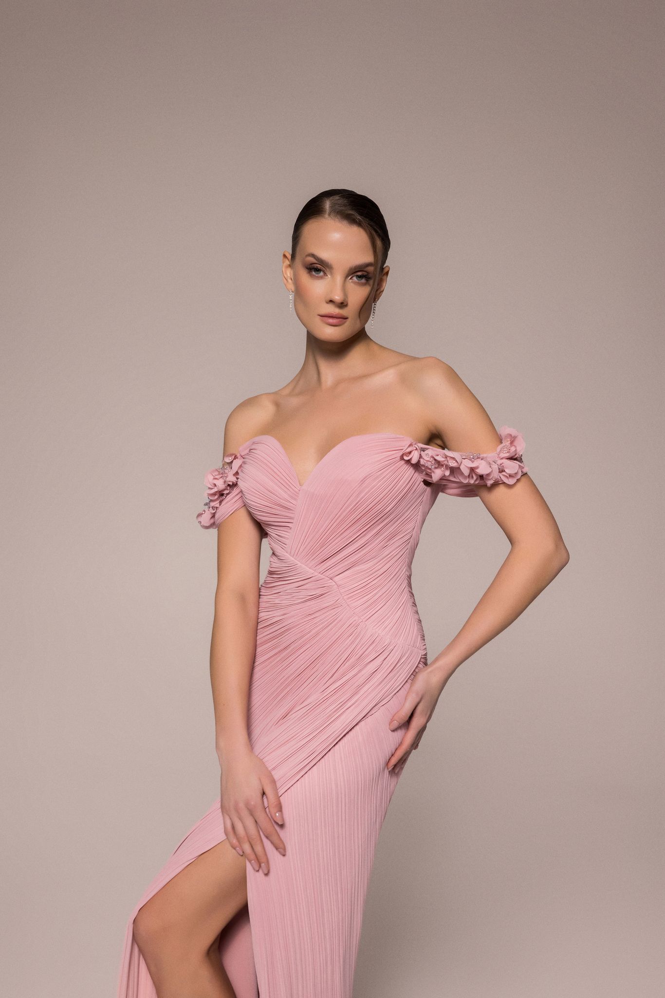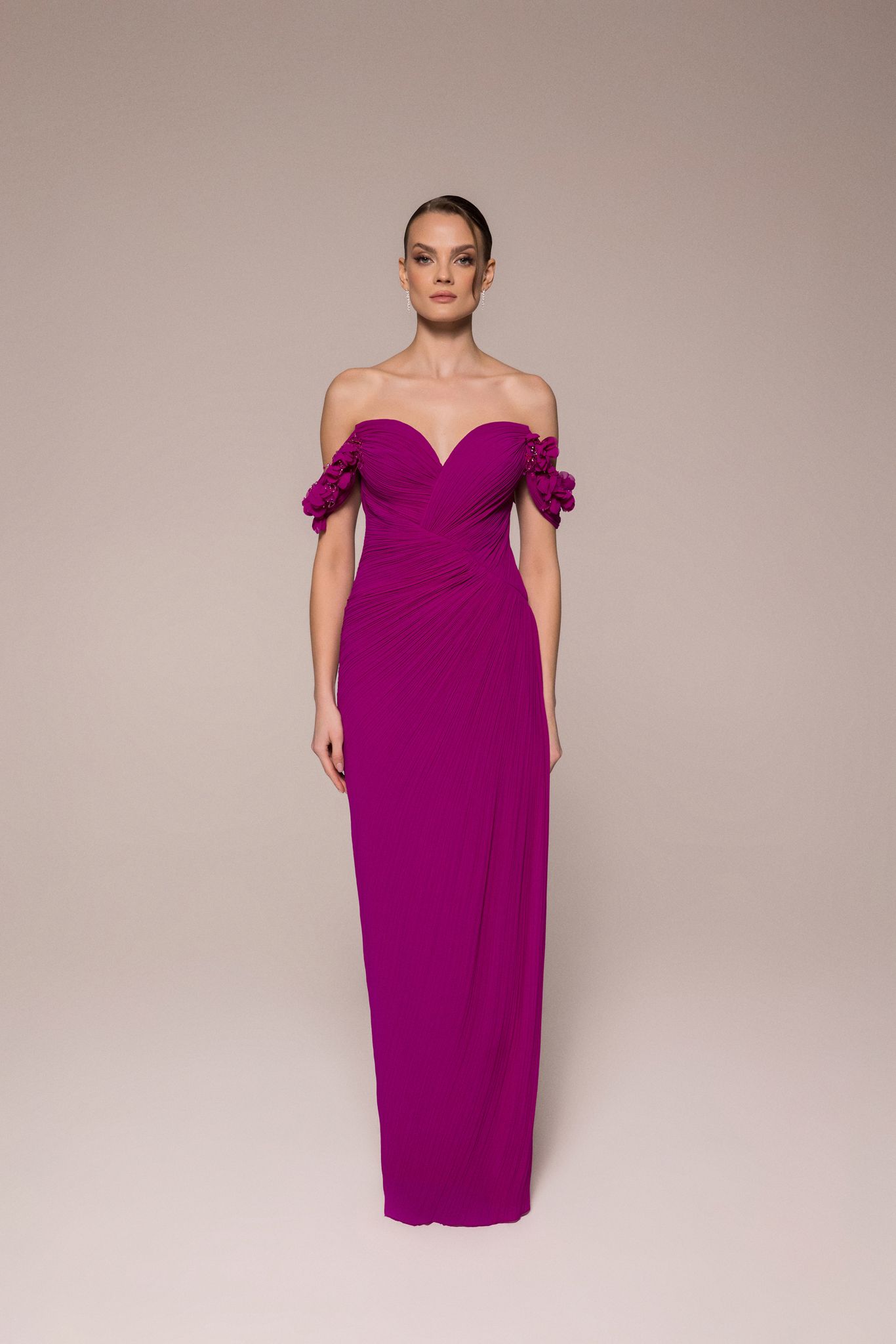 فستان سهرة بتصميم وقماش عصري مميز يتميز بحركة الاكتاف من قماش الثنيات الطولية يضفي جمالا ورونقا لاطلالتك