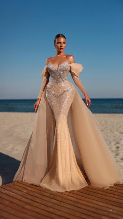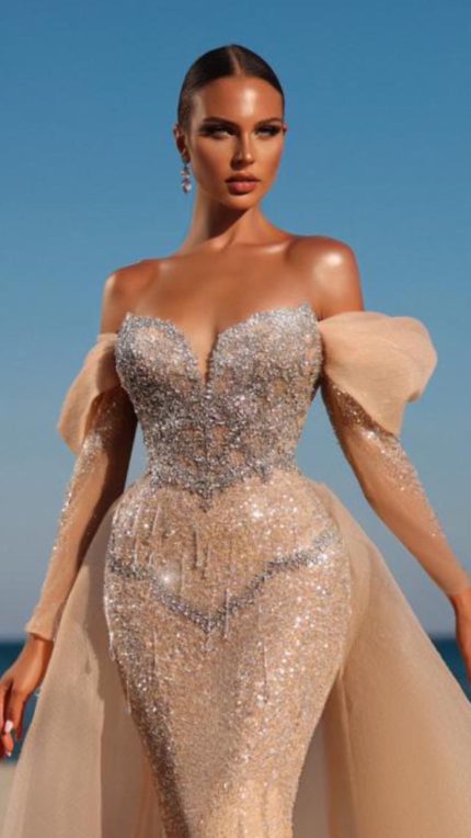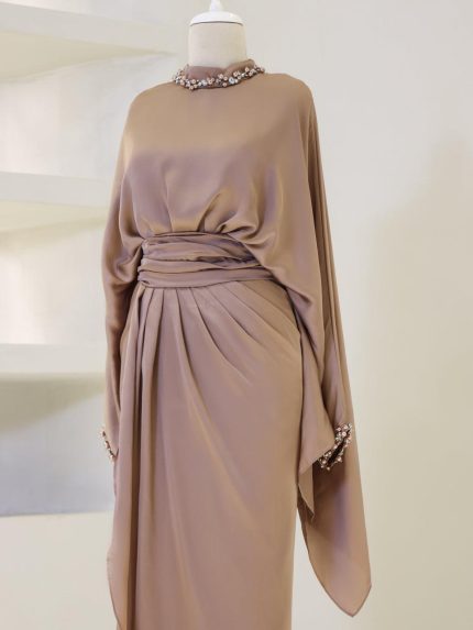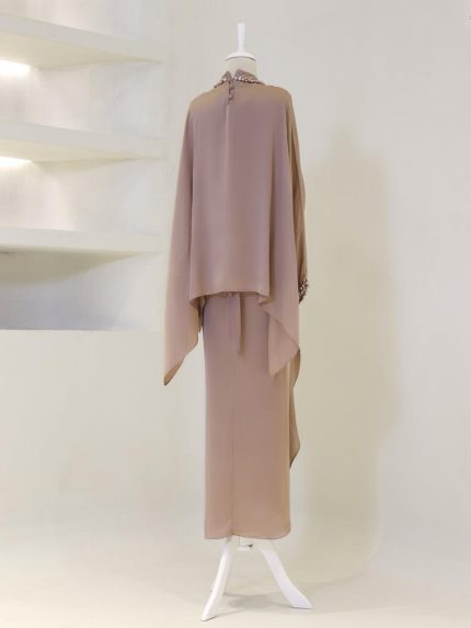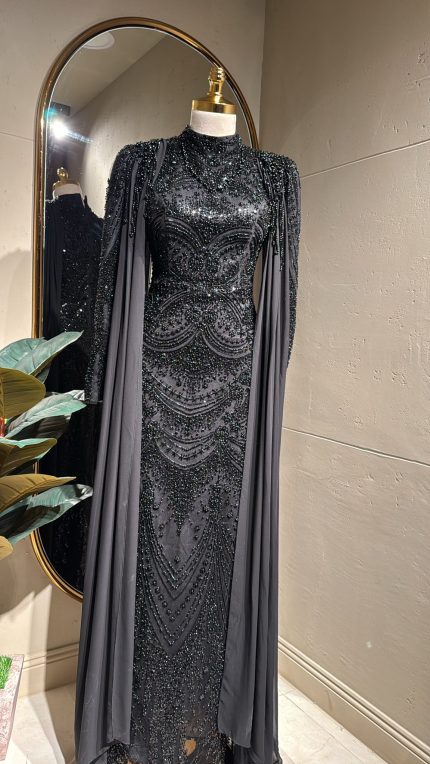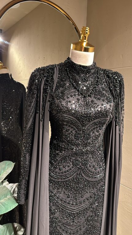 فستان بتصميم عصري مصمم بشك خرز يدوي من قطعتين منفصلات الفستان باكمام والكاب